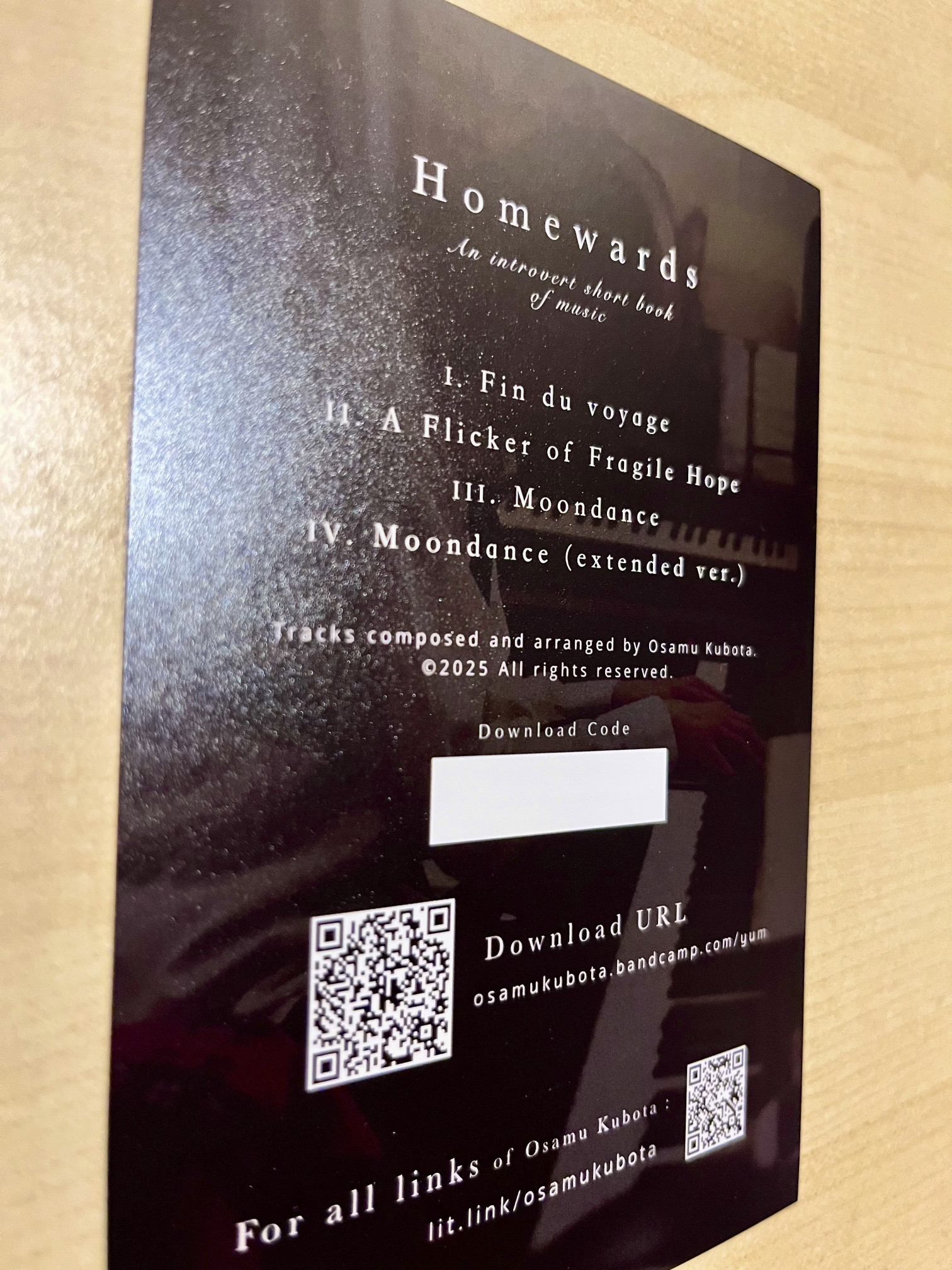 2025年秋のM3に合わせて発表されたOsamu Kubota新譜”Homewards”のBandcampダウンロードカードです。 ポストカードサイズで、作家サインを入れてお届けいたします。
